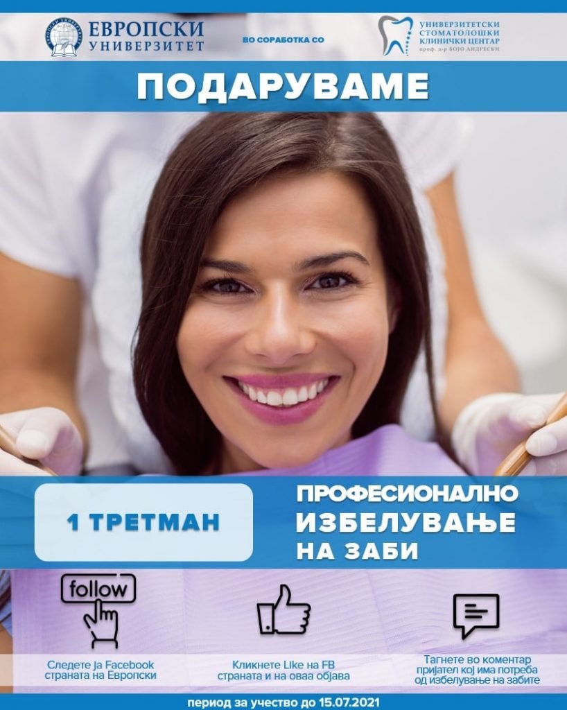 Почитувани, Европски Универзитет во соработка со Универзитетски стоматолошки клинички центар “Проф.Д-р Бојо Андрески” подарува третман за ласерско белеење на Вашите заби. Ласерското белеење на заби не […]