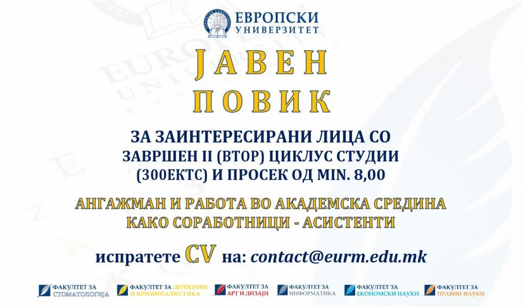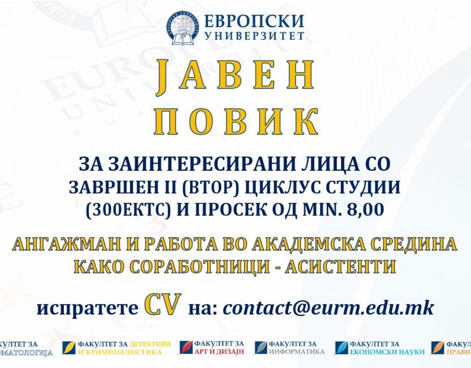 Управниот одбор на ЕВРОПСКИ УНИВЕРЗИТЕТ Скопје ги повикува сите заинтересирани лица со завршен II циклус студии (300ЕКТС) и просек од min. 8,00 на студиите од прв […]